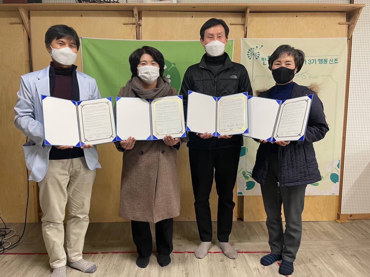 ▲ 민들레는 지난 2월 9일 "지역주민과함께사회적협동조합(이사장 황병도), 사회복지법인 대덕사랑교육문화복지재단 대덕사랑노인복지센터(센터장 이동선), 사회복지법인 대전가톨릭사회복지회 대전가톨릭노인복지센터(센터장 배종학) 등과 재가노인 의료·돌봄문제 해소를 위한 업무협약을 체결하였다.