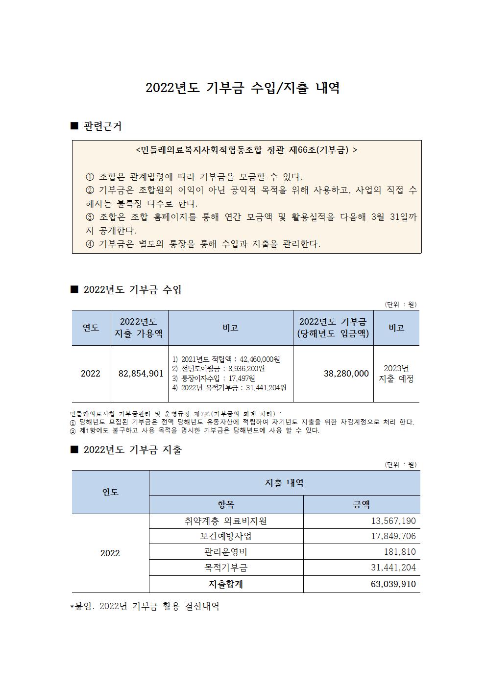 2022년 기부금 수입지출내역 보고