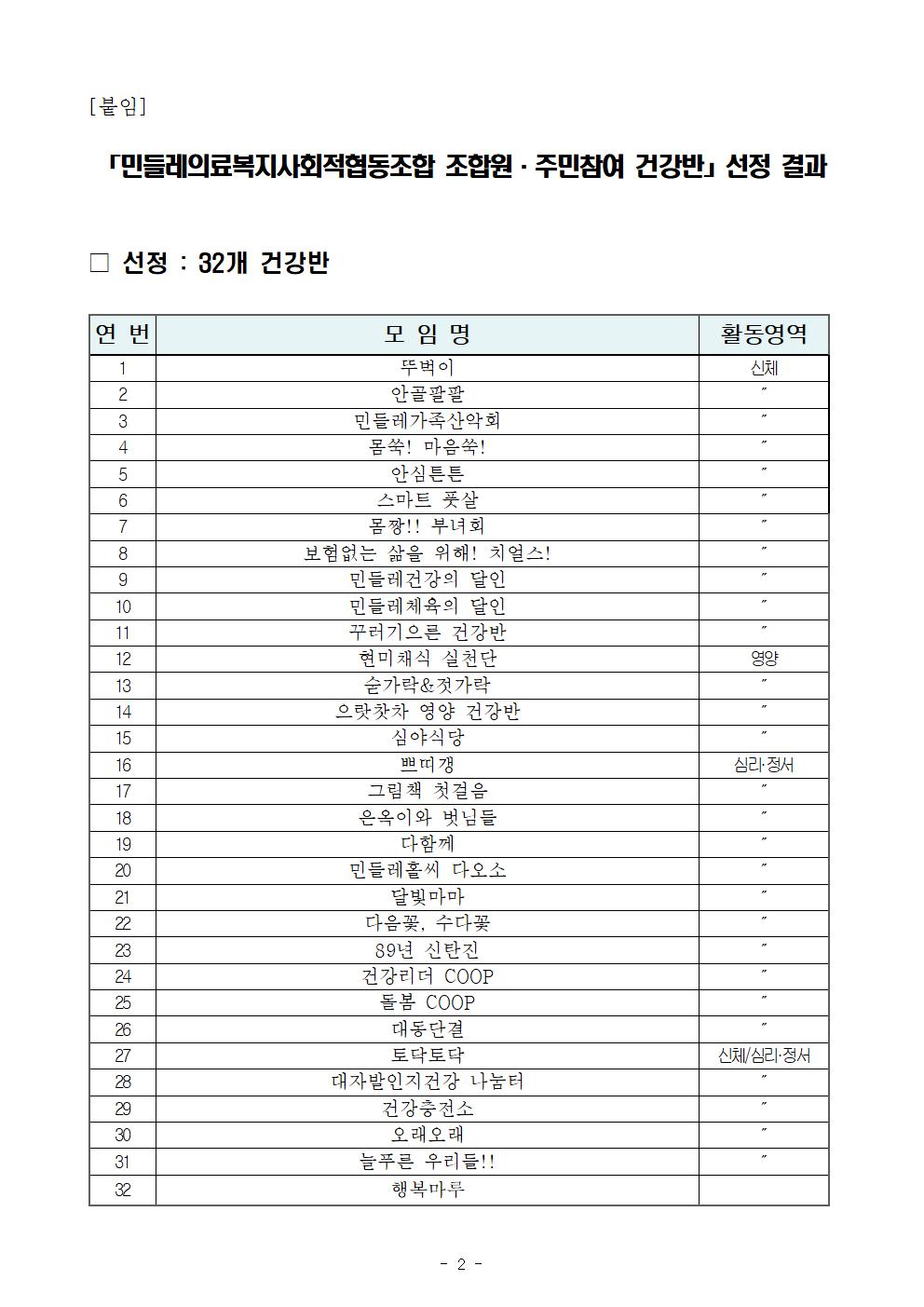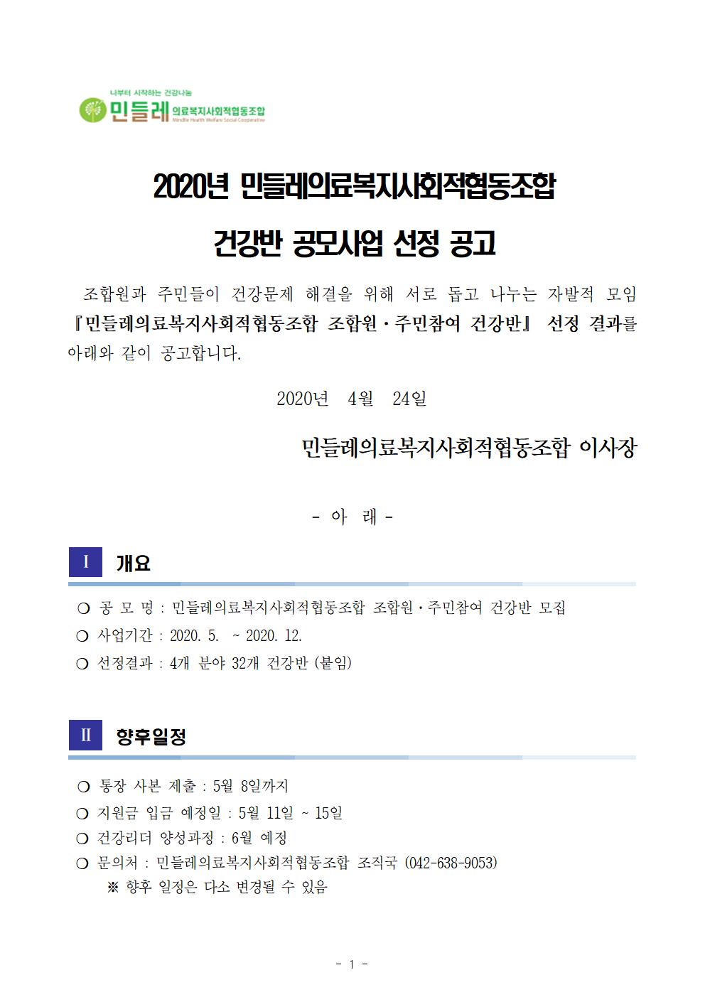 2020년 민들레의료복지사회적협동조합 건강반 선정 공고