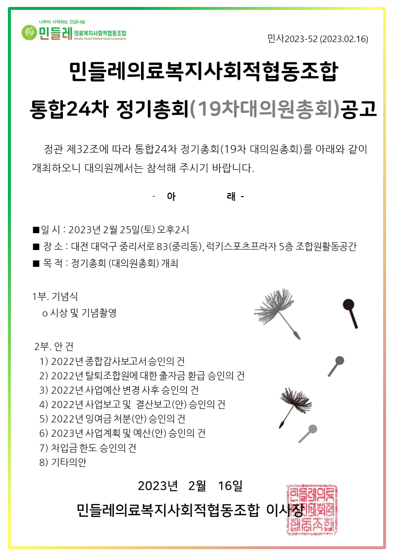 *대의원 총회는 위임이 되지 않습니다. 대의원님들은 꼭! 참석해 주세요