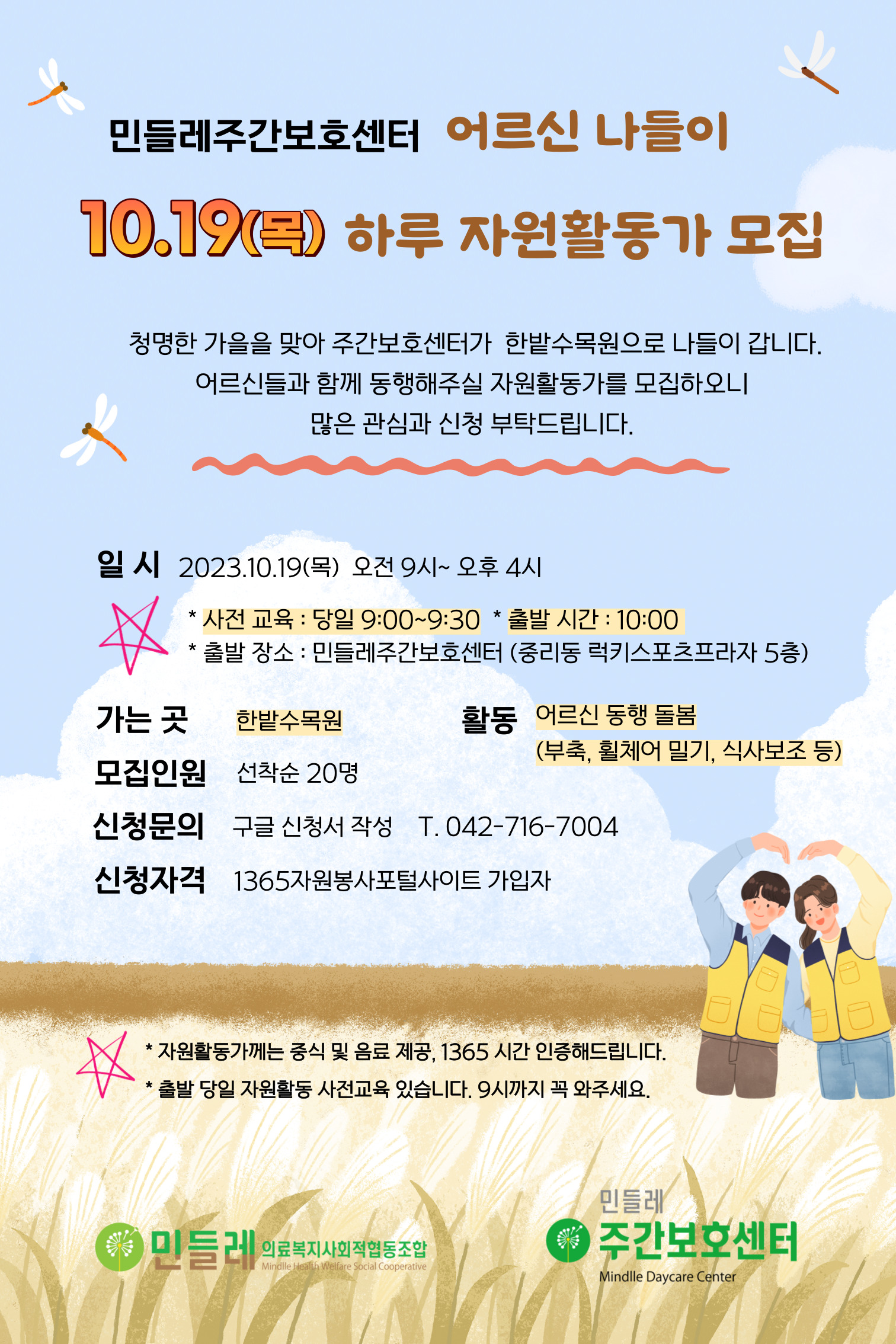 주간보호센터 어르신들이 가을 나들이를 갑니다. 어르신들을 모시고 함께 동행할 “하루” 자원활동가를 모집하오니,