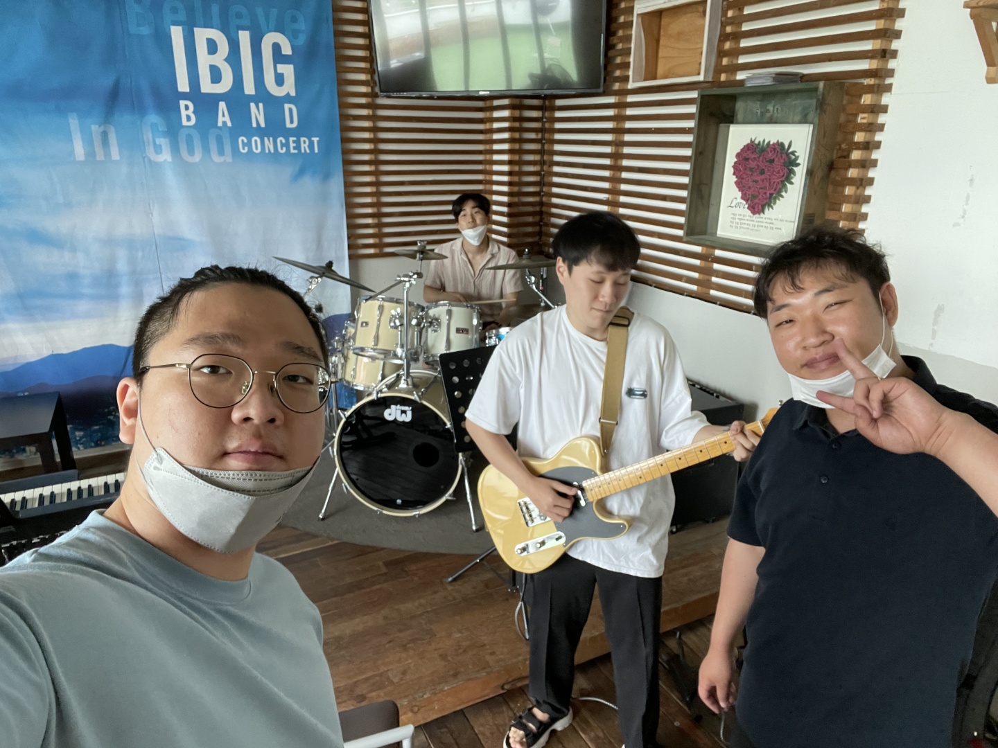 [3차 모임] 1. 첫 번째 합주 진행 (드럼 : 권인호, 베이스 : 전홍주, 기타 및 보컬 : 배은열, 키보드 : 황근하) 2. 윤수일의 '아파트' 연습 (훵크 스타일 편곡) 3. 김수철의 '젊은 그대' 연습 (모던 록 스타일 편곡)