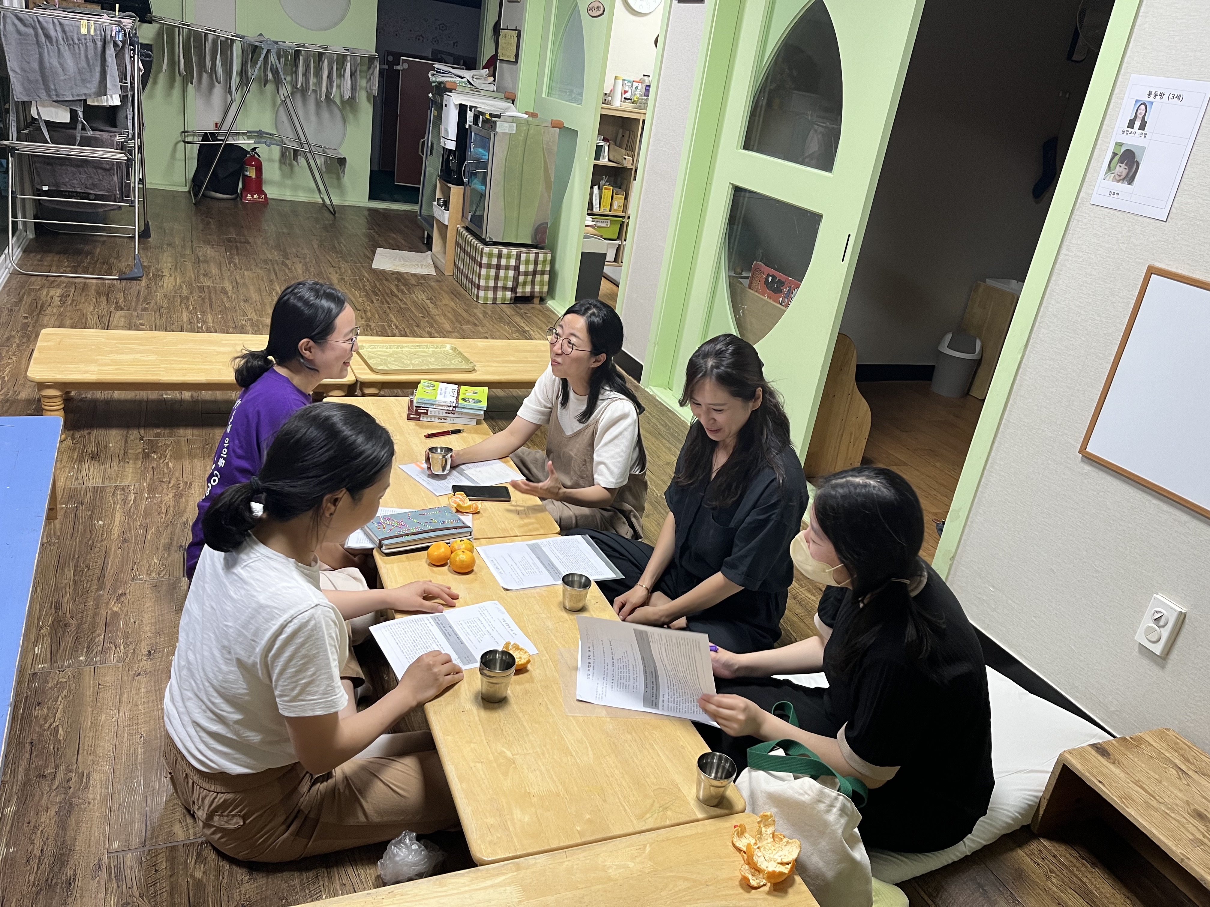 <놀면서 자라고, 살면서 배우는 아이들> 책을 함께 읽고 나누는 시간을 가졌습니다 친구랑 어린이집의 별명부르기, 마실, 날적이쓰기, 공동체 문화에 대한 발제와 생각을 이야기했습니다