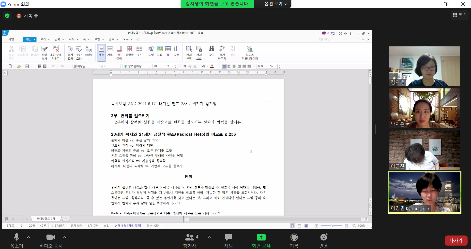 래디컬 헬프 책 3부를 다함께 읽고 모여 토론함. 역량 중심 접근과 관계 중심 접근이 내용의 핵심이었음. 또한, client에 대한 신뢰와 권한 이양의 중요성과 현장의 어려움에 대해서도 논의하였음. 많은 사회복지, 보건의료 정책/제도에서 성과 평가를 어떻게 개선할 수 있을지, 돌봄의 질에 대한 평가를 개선 할 수 있을지 여러 사례들을 공유하였음. 지역적인 맥락을 고려해야 사업 실패 가능성을 줄일 수 있음.